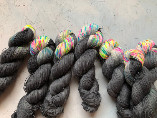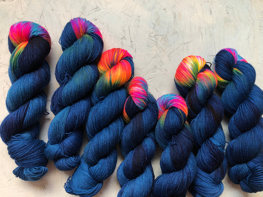 We offer two main types of planned pooling yarn - our assigned pooling or long zips; and our zip yarns. All these yarns have a base colour which is then complemented with a burst (or zip) of colour. We are the home of assigned pooling yarn in the UK and have been creating these clever effects since we brought out Heterochromia (still one of our best selling yarns).