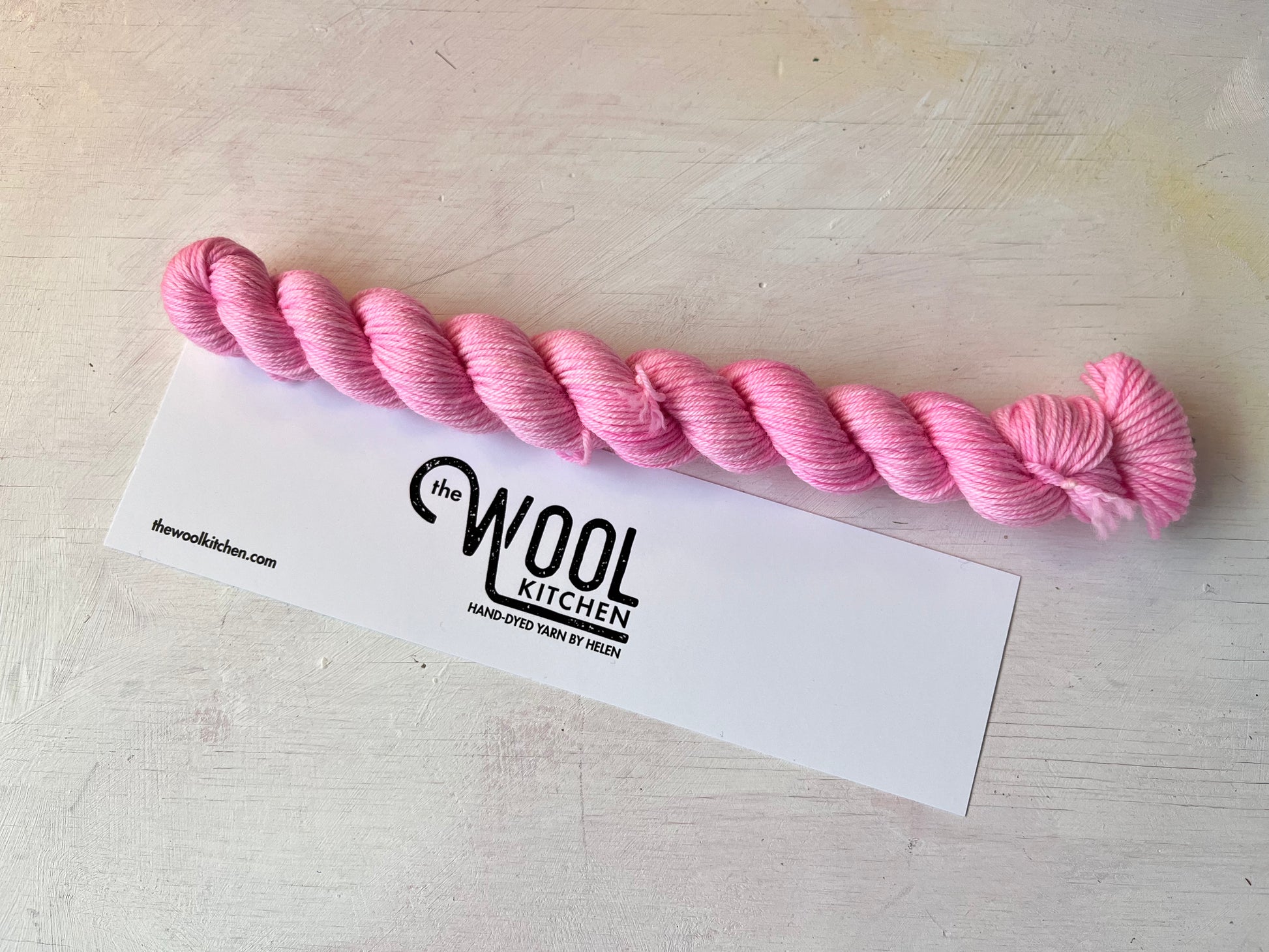 Helen's unique dye technique ensures that you get a consistent look throughout the skein meaning this is a low pooling yarn when knitting socks. Our contrast mini colour way this month is Petal Pink - a soft pink.