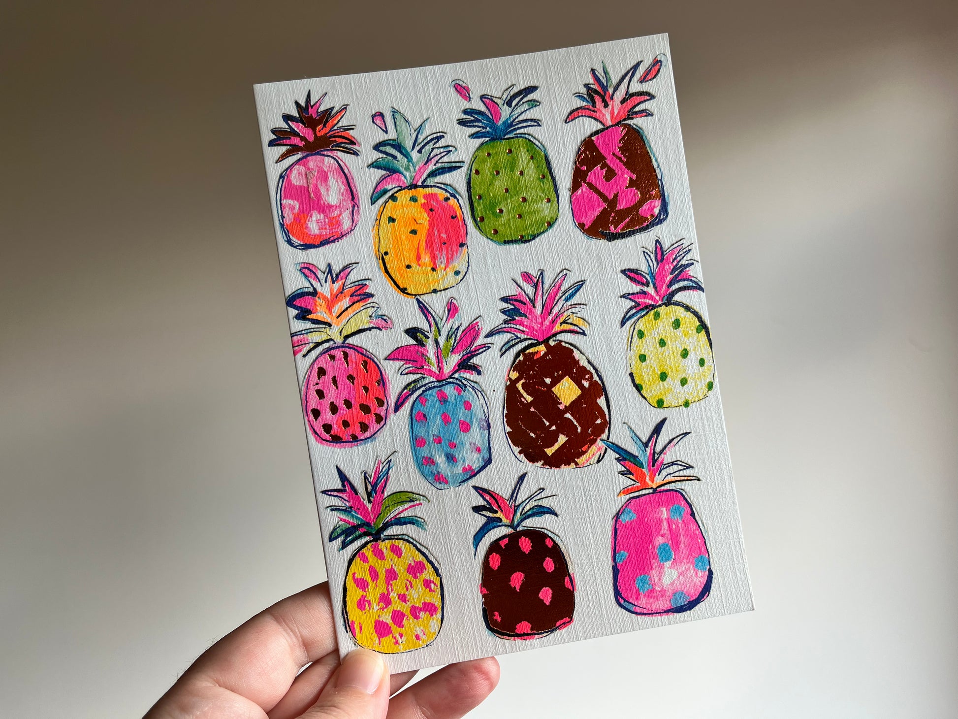 Our final yarn out the archive is Pineapple Riot. Helen's spirit fruit is a pineapple - a little bit quirky - and as such gets given lots of pineapple inspired gifts! Pineapple Riot is based on a birthday card from her friend Tess. Pineapple Riot is a variegated neon yellow yarn with splashes of neon lime, neon orange, neon pink and neon violet. It's a real mixed fruit!